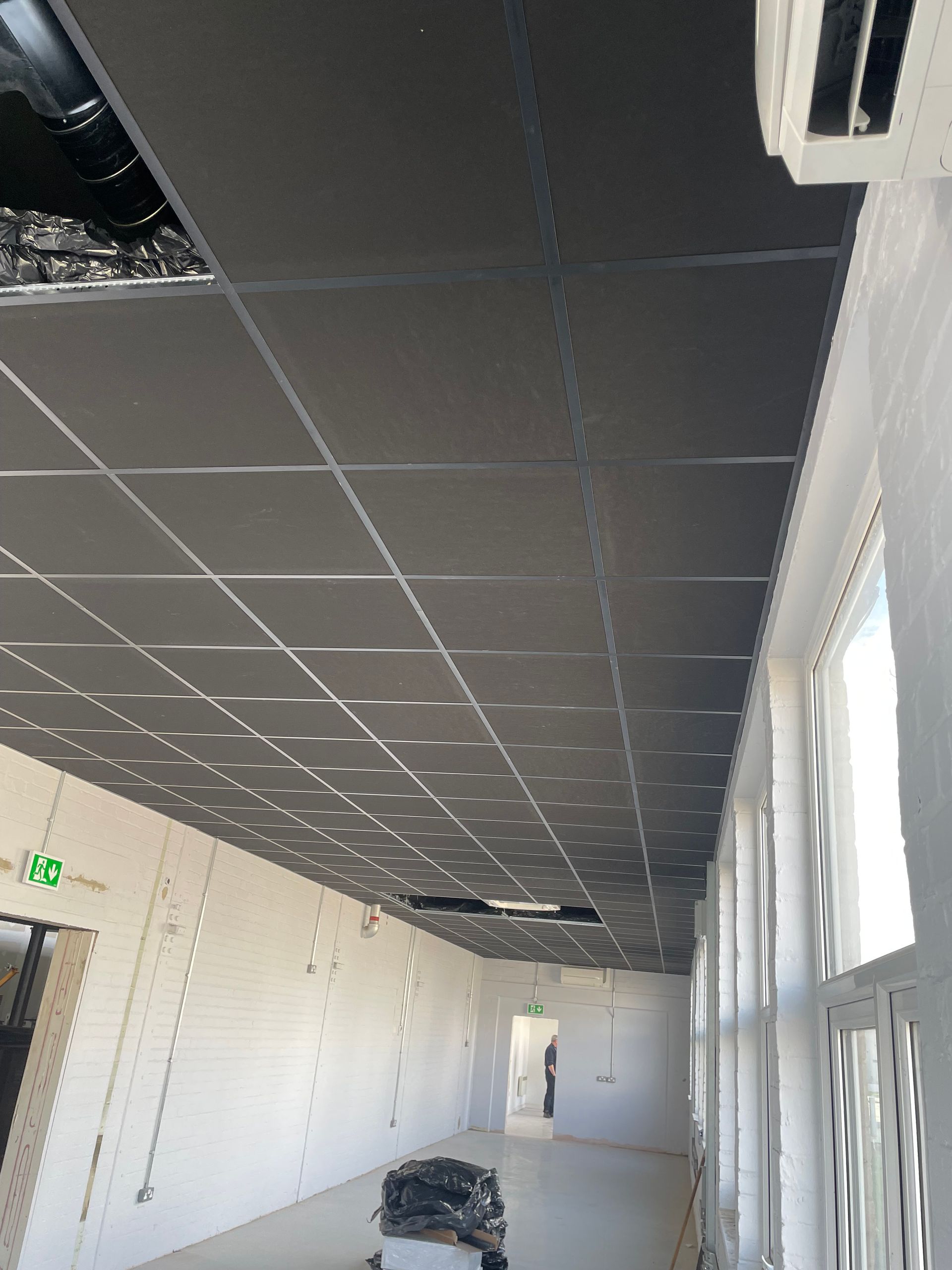 After a detailed site visit and consultation, our team designed and installed a suspended ceiling tailored to the client’s specifications. We used black tiles and matching black grid guides to deliver a modern, industrial finish that elevated the look of the office while still offering practical benefits such as acoustic control, easy access for maintenance and a clean, professional appearance.